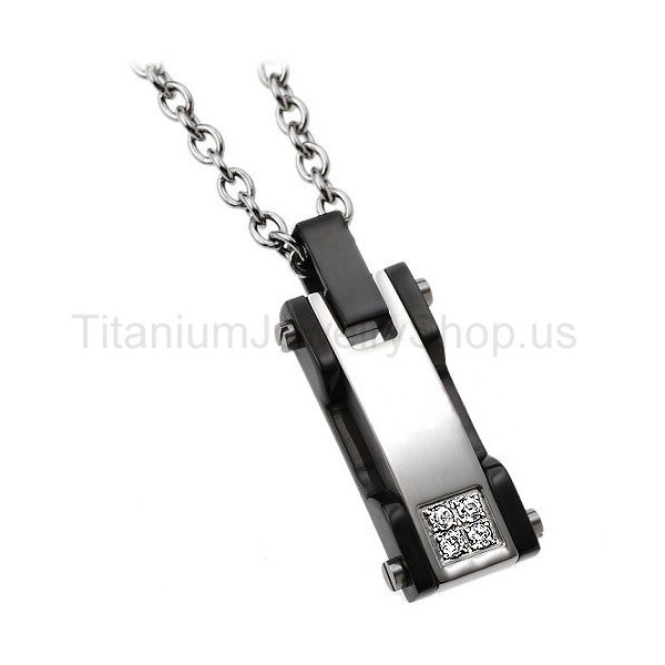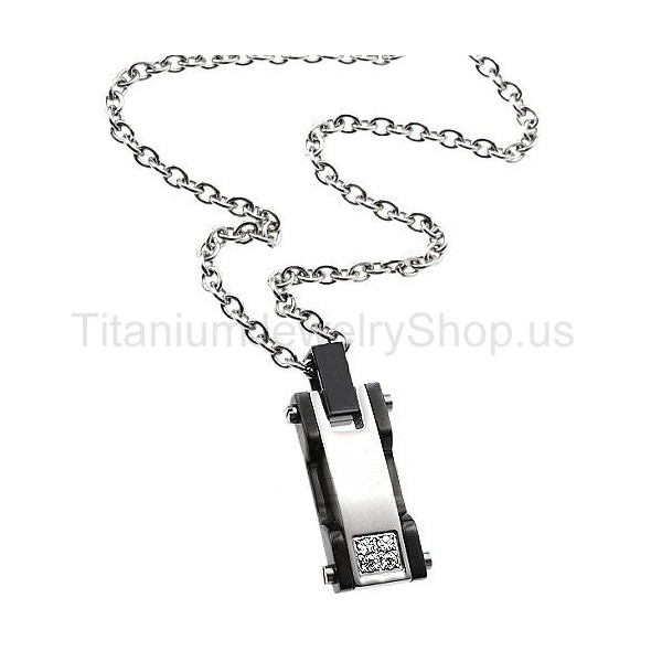 Metal: Titanium Dimensions: 1 1/5 inches x 1/2 inch Chain: Titanium, 20"