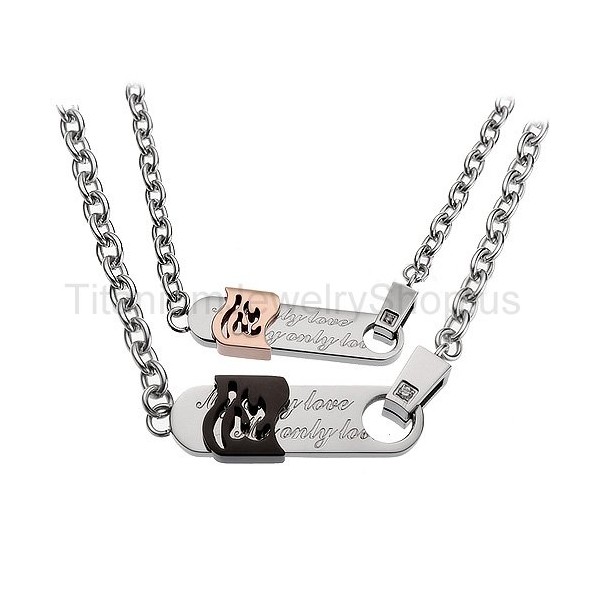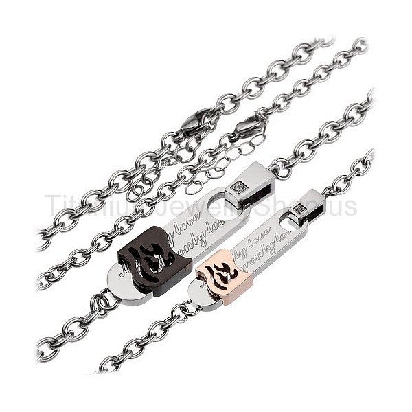Metal: Titanium His size: 2/5" x 1 9/10" Her size: 1/3" x 1 1/2" Chain: Titanium, 20"