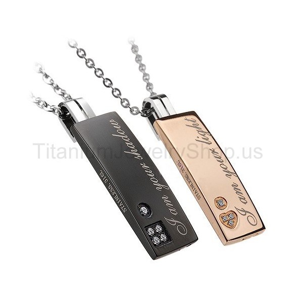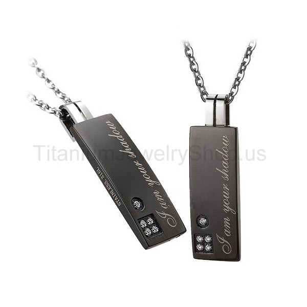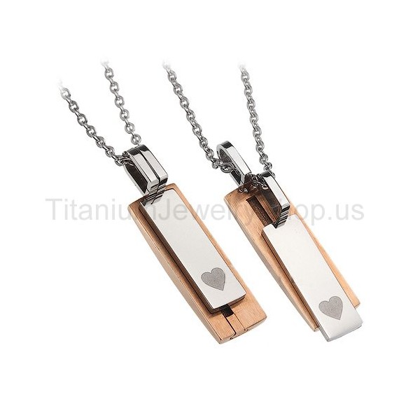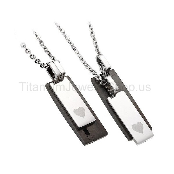 Metal: Titanium His size: 2/5" x 1 2/5" Her size: 1/3" x 1 1/4" Chain: Titanium, 20"