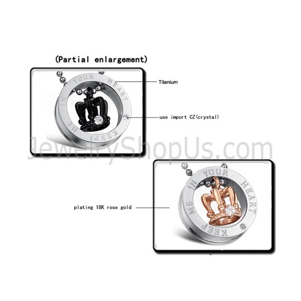 Titanium Rose Gold and Black Royal Crowns "Keep Me In Your Heart" Lovers Pendants with Rhinestones and Free Chains C603