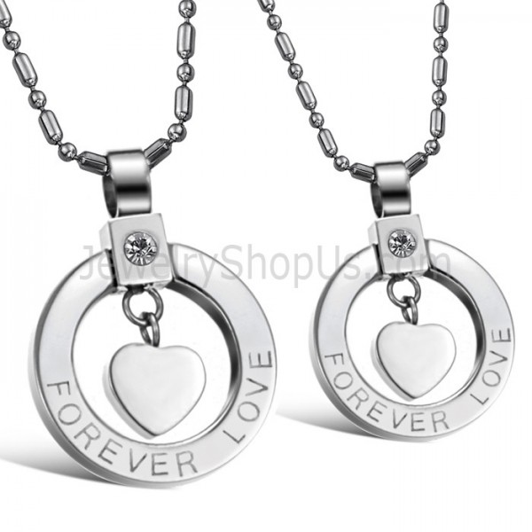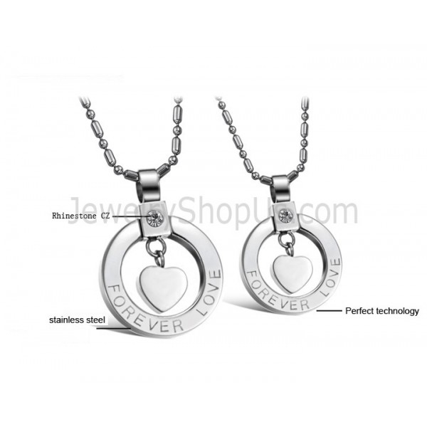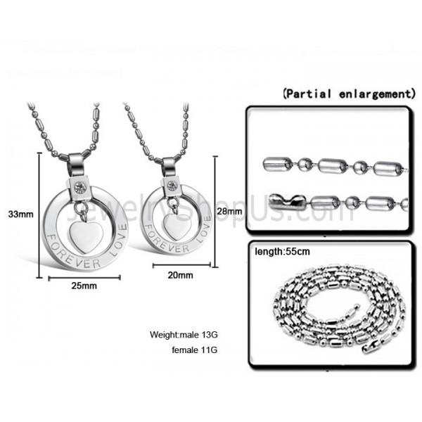 Titanium Silver Sweetheart "Forever Love" Lovers Pendants with Rhinestones and Free Chains C415