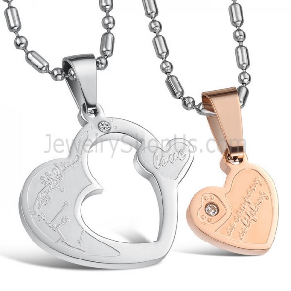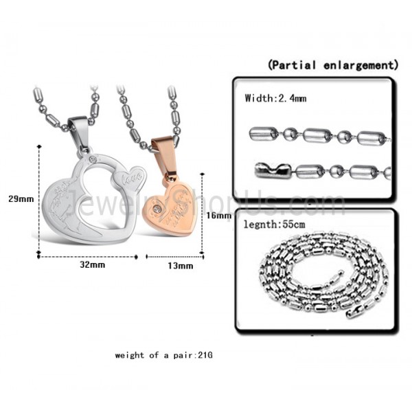 Titanium Rose Gold and Silver Sweetheart Lovers Pendants with Rhinestones and Free Chains C600