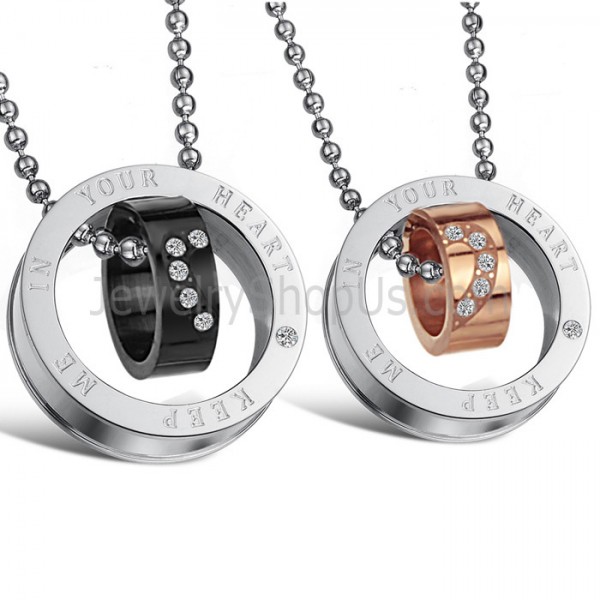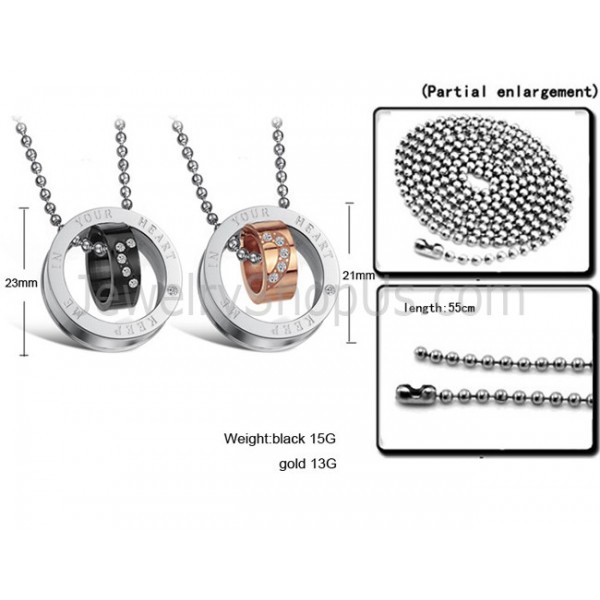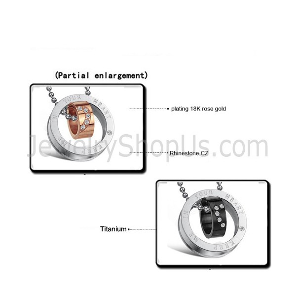 Titanium Rose Gold and Black Rings "Keep Me In Your Heart" Lovers Pendants with Rhinestone and Free Chains C673