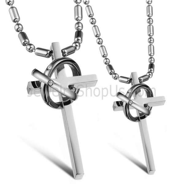 Titanium Silver Cross Lovers Pendants with Rhinestones and Free Chains GX724
