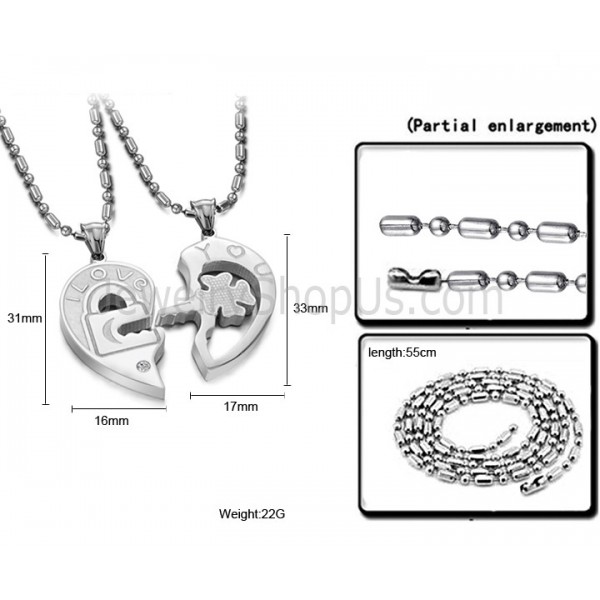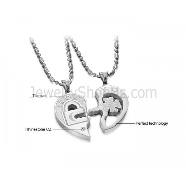 Titanium Sweetheart Key and Lock Lovers Pendants with Rhinestone and Free Chains C553