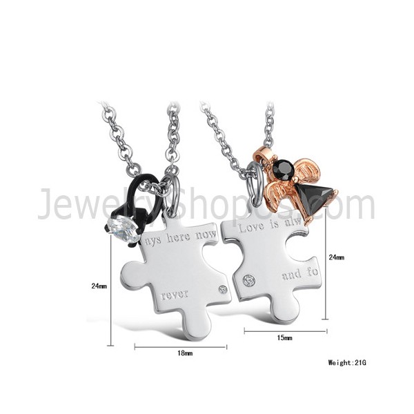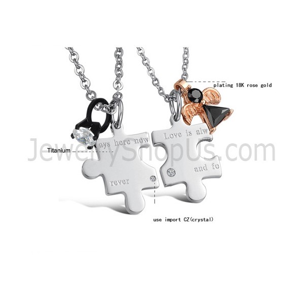 Titanium Silver "Love is Always here now and Forever" Lovers Pendants with Rhinestones and Free Chains C608