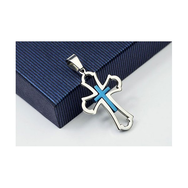 Pretty Mens Hollow Blue Titanium Cross Pendant - Free Chain